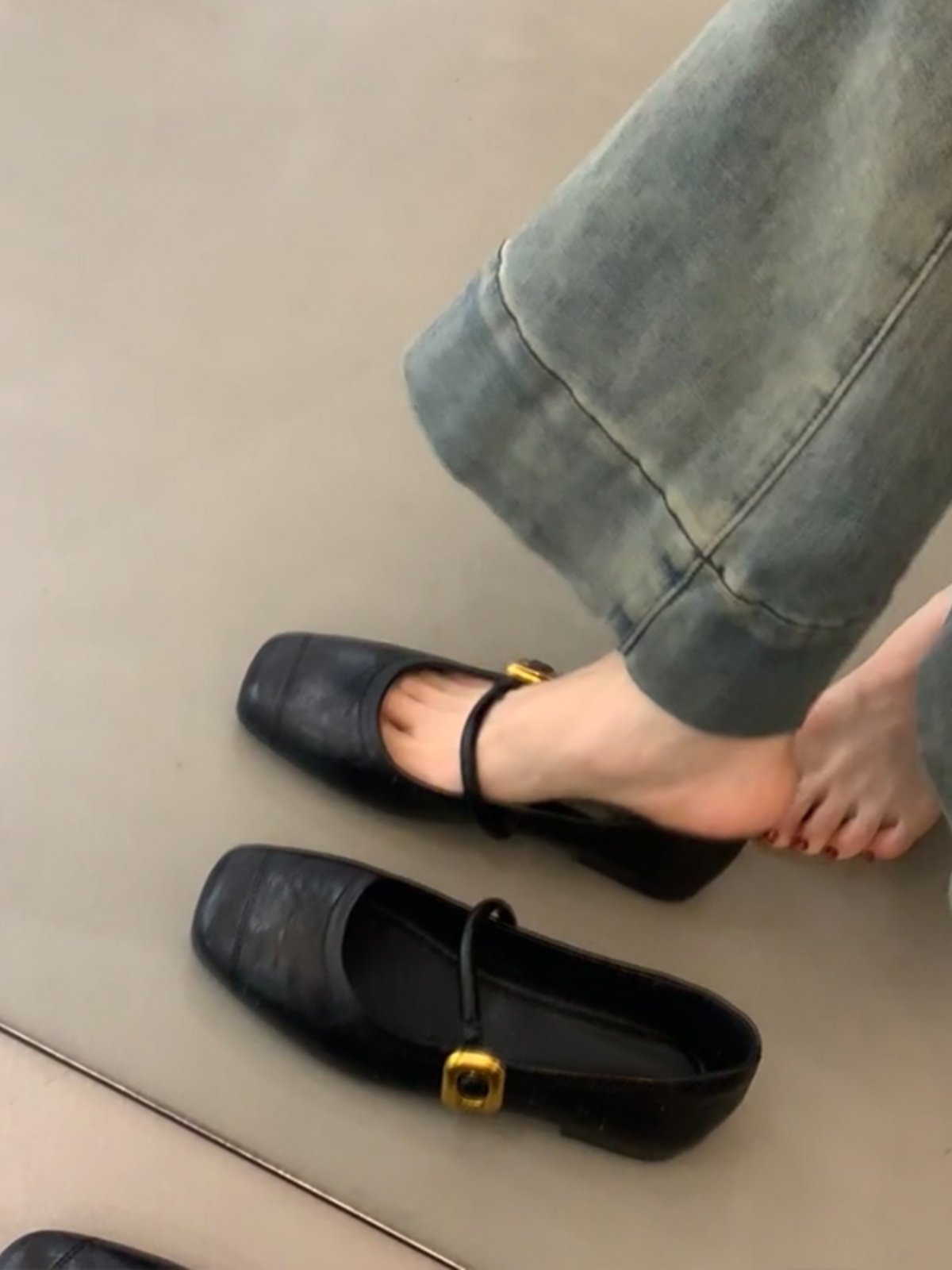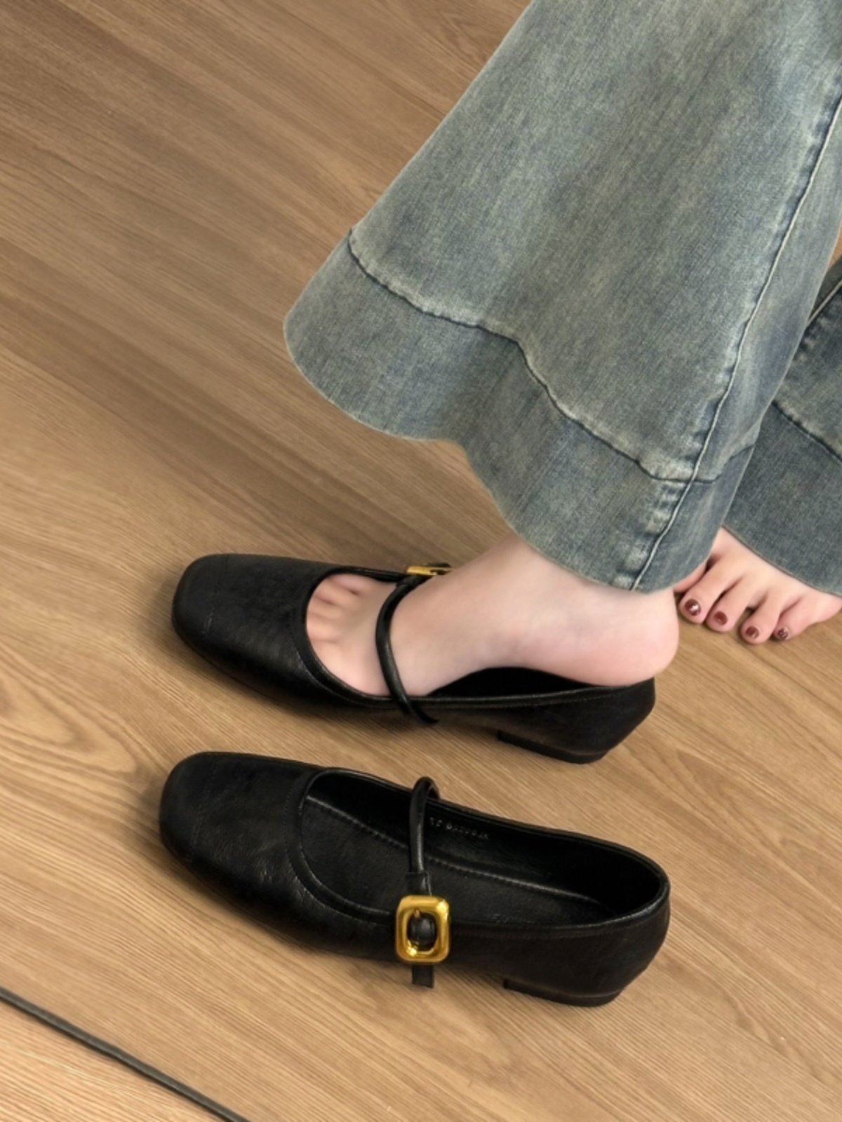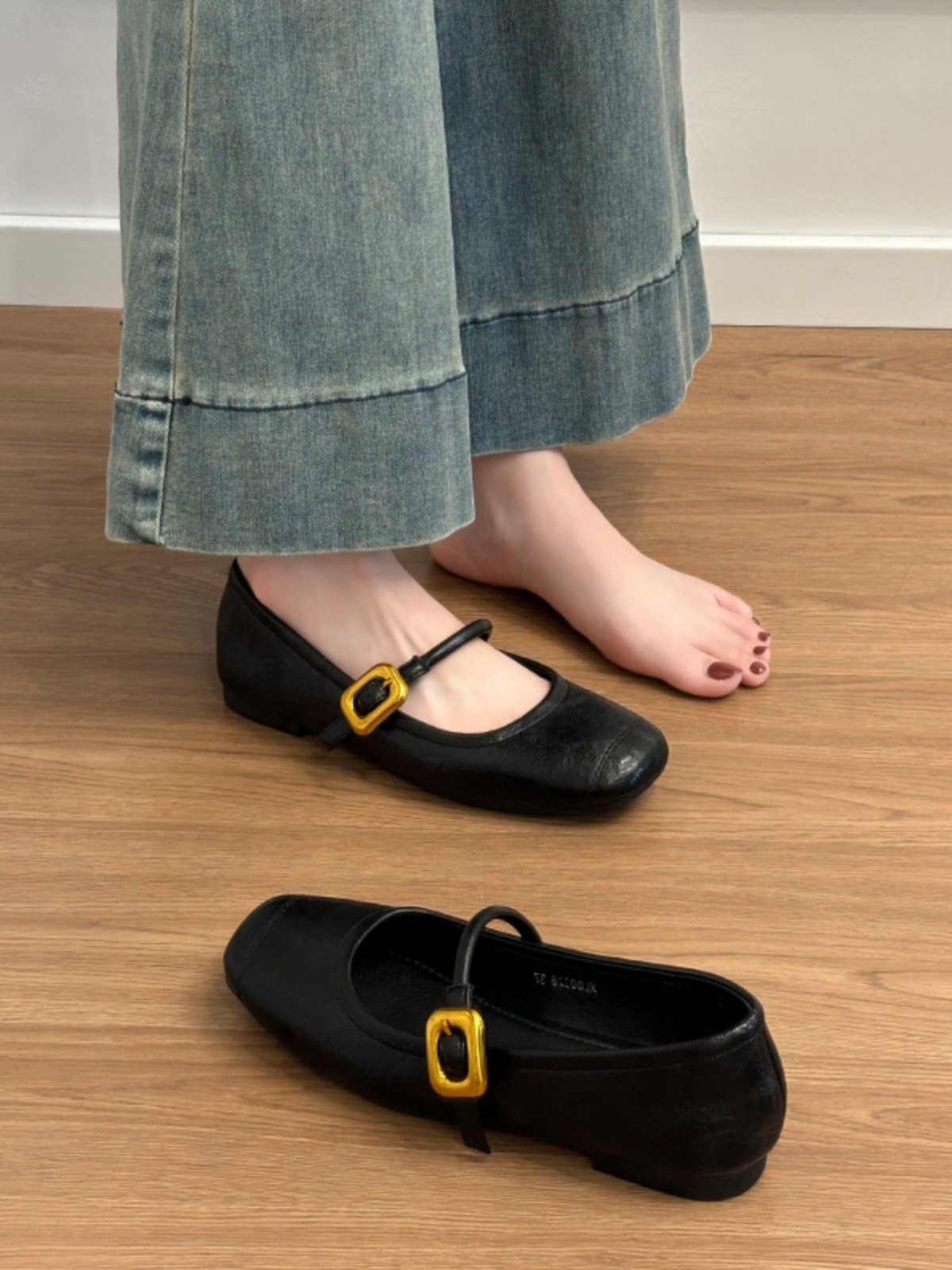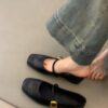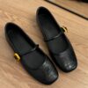 • Signature Gold Square Buckle: A striking, high-shine gold buckle adds a touch of vintage “It-Girl” glamour to the minimalist black leather, elevating the shoe from a simple flat to a statement piece.